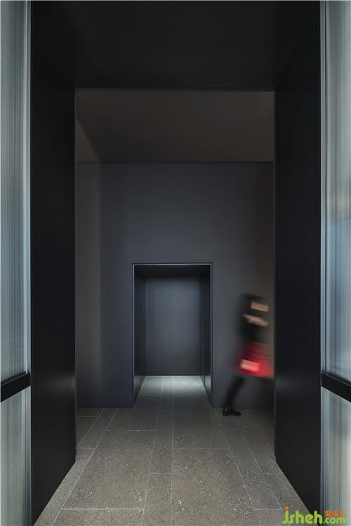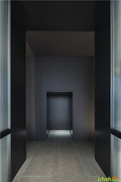过道的空间尺度刻意收窄,静谧、冷峻的气息迎面而来,迅速将人挟裹其中,让人即可感觉到空间的震慑力与仪式感!