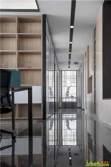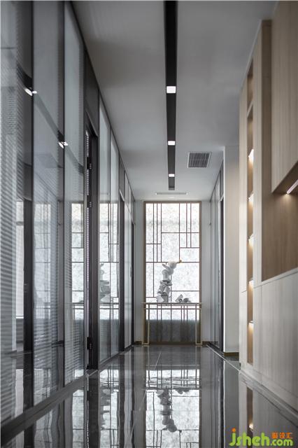 可容纳多人的会议室,天花的造型与会议桌相呼应,大面积的落地玻璃让整个空间更加明亮。