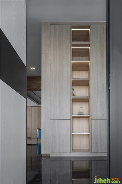 办公区中心设计大桌子,所有附属机能如电子屏幕、柜子、打印机室、建材室、书籍等配置在空间周边,每个员工可灵活走动、交流。