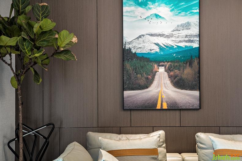 再者,室内设计师考虑到客厅其实承载更多的是一个家的日常,同时汇聚着共同的生活目标与每个家庭成员的生活轨迹,设计师选用了高级灰色调做底色铺排平淡过渡,但细节处理画龙点睛,描绘出业主一家对于未来生活的憧憬和探索冒险主义精神,灵活生动的渲染着空间氛围,比如陈设挂画上公路元素的黄色线条,与抱枕的有趣互动,让艺术延伸到现实,让空间打破固有局限与思想的束缚。最美的风景一直在路上~~~
