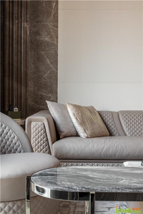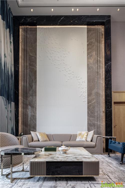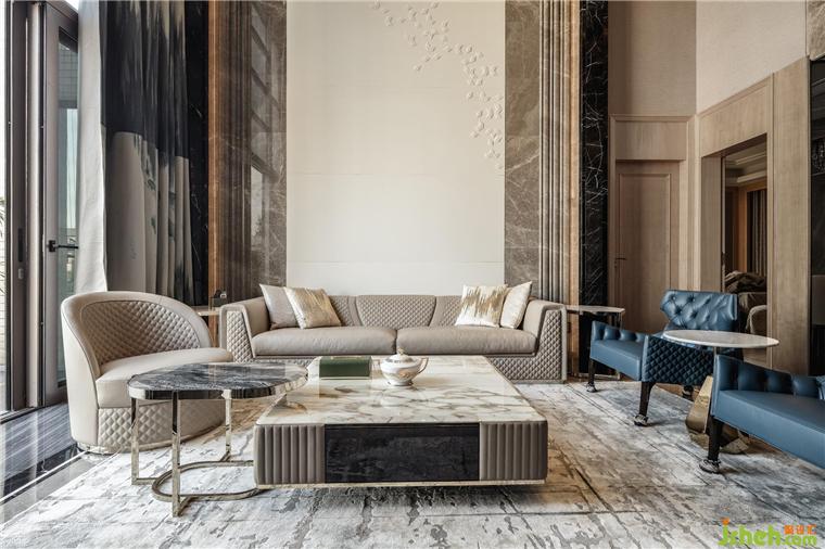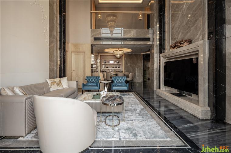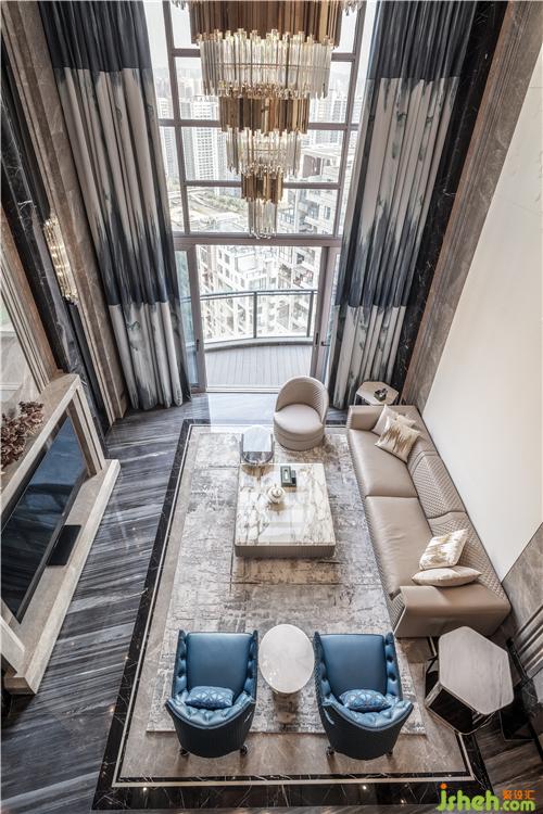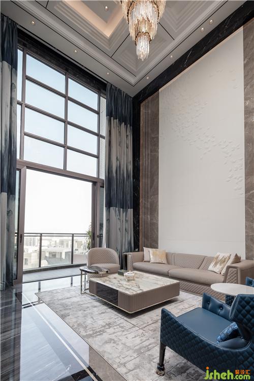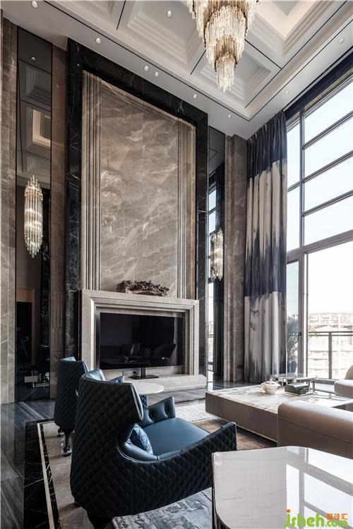 从玄关进入挑高开阔的客厅,灰色大理石与水晶吊灯碰撞出的艺术张力,兼具秩序感与灵动性,点缀天海般纯净的蓝色,演绎出浩瀚苍穹,这源于人们对于山峦、流水、丛林、天空天然的向往,它们一方面象征着自然力量,可以不断滋养内在精神,一方面温润柔软,总能带给生活许多灵感和滋养。