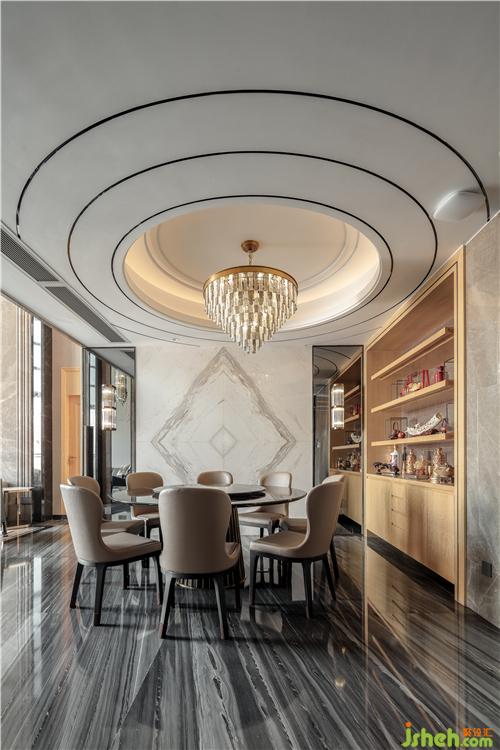 雅观自在,贯穿整个餐厅的设计,可以看到传统寓意“玉牌”造型水晶吊灯将平安如意的福愿,转化为层层水波造型吊顶,随涟漪荡漾开让喜乐充盈整个家,与根繁叶茂的美好寓意相映成趣,滋养身心。