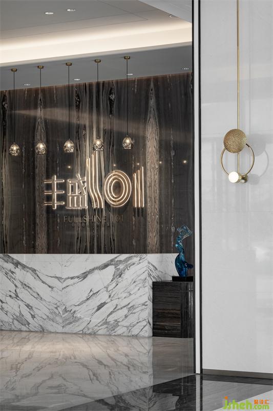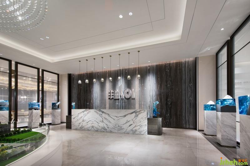 体验中心装修设计背景墙的黑云石蕴藏天然流畅的龙纹,与两侧的“生命之源”海蓝艺术屏风,形成刚柔并济的源泉动力,为丰盛101藏风聚气,寓意生活事业风生水起。