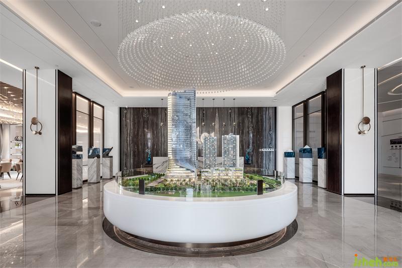 以水之和聚天地灵韵——国学五行之道的“水育万物,水孕聚财”为迎宾展示区的设计主题。沙盘底似白玉聚宝盆,剔透水滴形小灯珠汇聚而成的弧面水晶灯饰,犹如甘霖天降,汇入白璧无瑕的聚宝盆中,滋养着这片富贵天成的风水宝地。