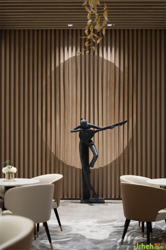 空间视觉上以具有流畅线条感的艺术曲线展现,糅合延伸联想听觉的丝弦艺术品,与项目建筑外观的大气弧形轮廓线条相呼应,展现建筑生命力生生不息的丰硕美好,以积极正能量乐享生活的美好诉求。