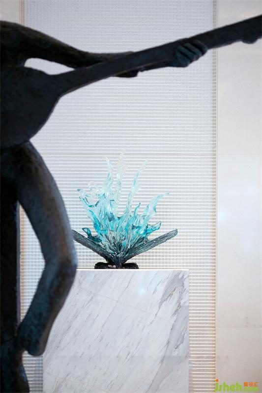 体验中心装修设计回归水系主题——海蓝般清新的树脂艺术雕塑,与白玉色石材上3D雕刻拉槽的精雕技艺,在理性与艺术的碰撞中,拒绝平庸,激起非凡丰盛的生命水花,无处不在的彰显出丰盛101的匠心精神。