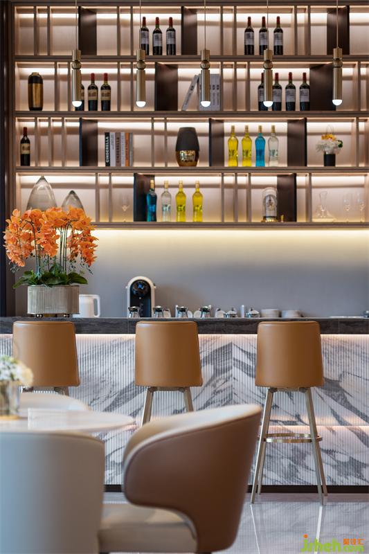 水吧台的天然大理石突破以往镜面打磨的常规设计,通过线条精雕工艺,和谐空间中整体流畅的艺术线条,与在深浅撞色中形成错落别致的酒柜,在金属水晶灯饰与暖色背景光的映衬下,刻画现代时尚的轻奢韵味。