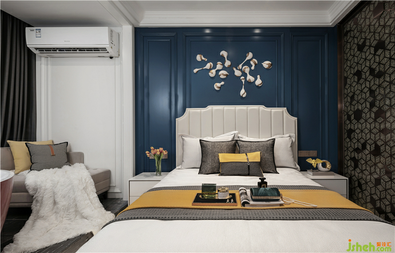 主卧延续客厅主色调,空间形态与视觉陈列彼此呼应,打破沉闷。饱和色彩表达出对生活的喜悦与热爱。摆件、装饰物限制在统一风格,随性搭配,不失趣味。情趣十足的收纳柜放置其中,让空间充满时尚现代艺术气息。