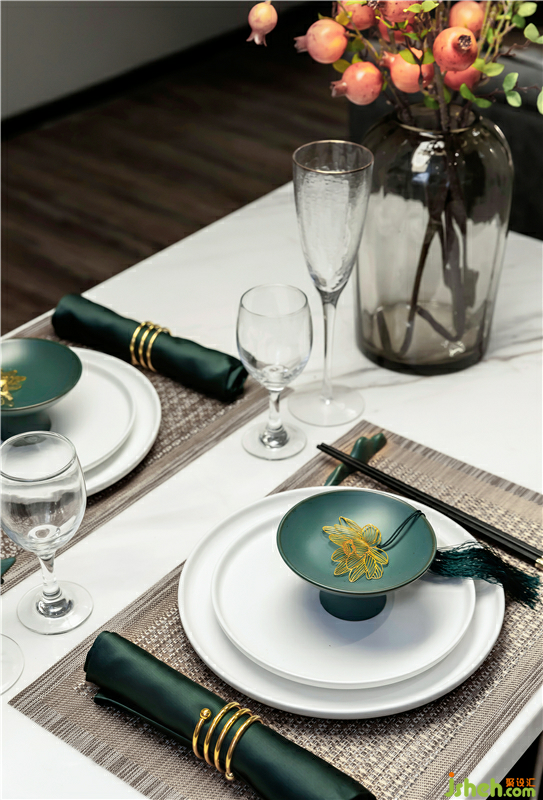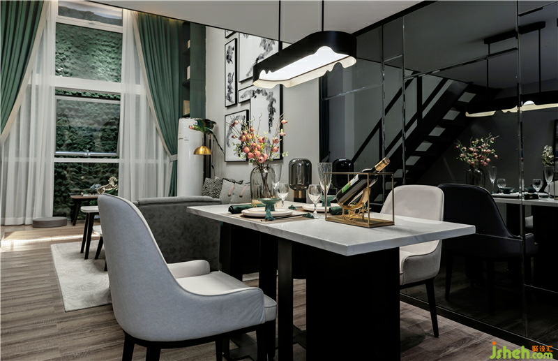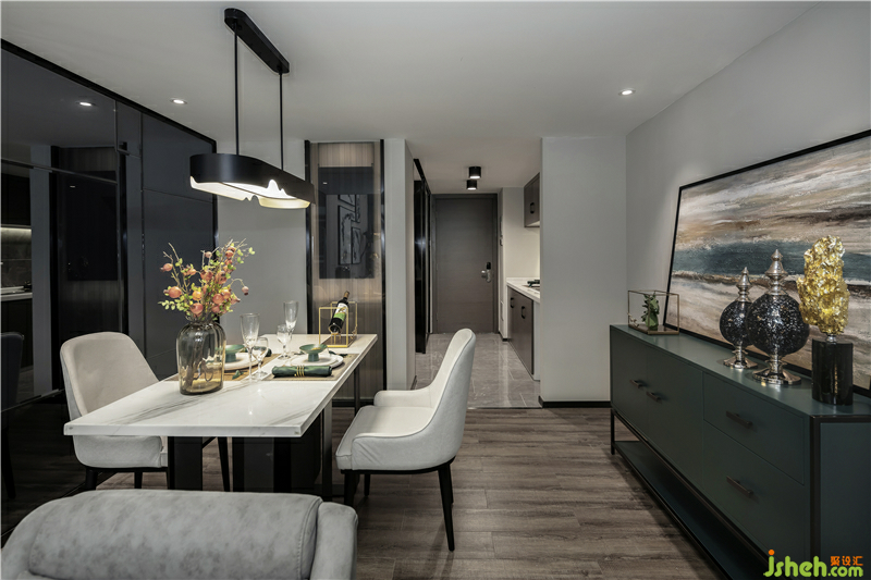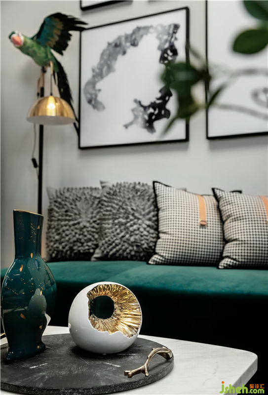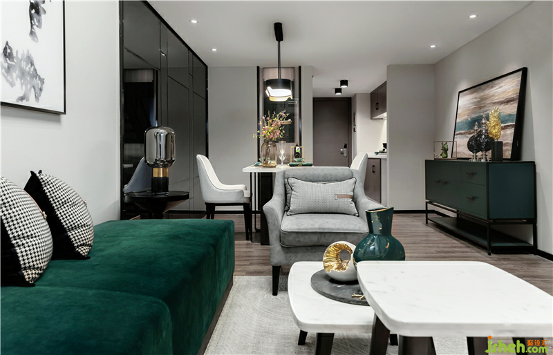 灵山秀色,空水氤氲,我们以墨绿色为主色,返璞归真。将色彩切割出的多层次变化与营造出的东方意境相结合,家具、饰品、挂画的局部天青色点缀,使空间富有灵性。