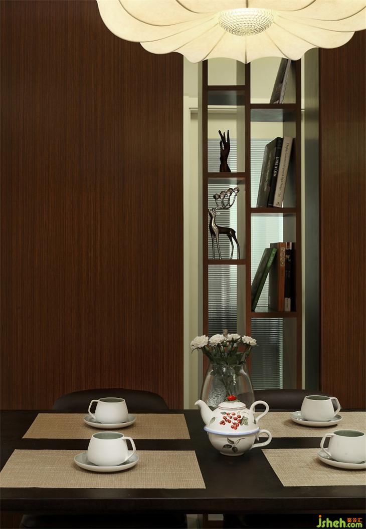 餐厅采用通透的格架代替隔断,不仅遮挡卫生间,同时也划分区域。木饰面也暗藏了储藏功能,足以收纳所屯的那些书和用品。