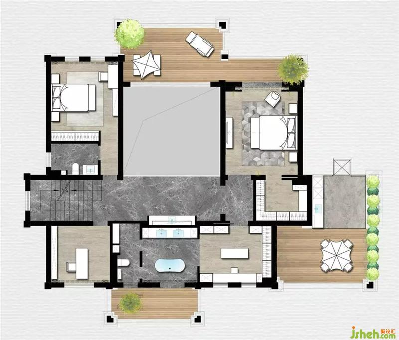 主人房尽显沉稳大气之势,整体本白色的色调,当中以蓝色为点缀,彰显干练的同时,又不失宁静的氛围,让主人在繁忙的工作中能够回到家中停下来,静下来。