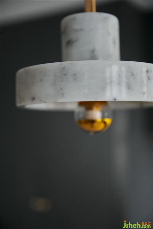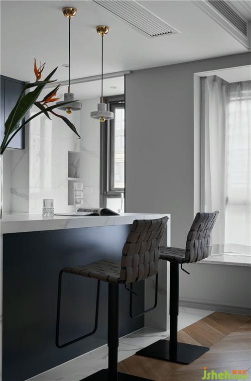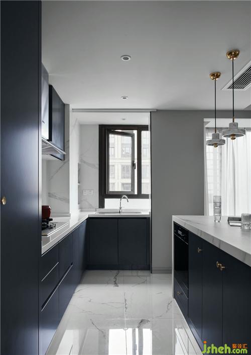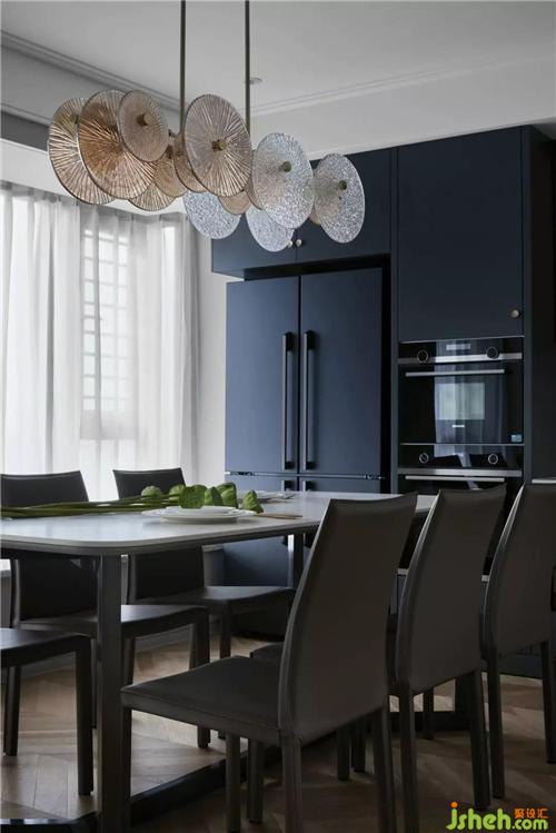 厨房深灰蓝的橱柜与墙壁上花白大理石铺陈交汇出冷调的内敛矜持又不失高雅的氛围,餐桌上的水晶玻璃吊灯,温润精致,充满了艺术美。