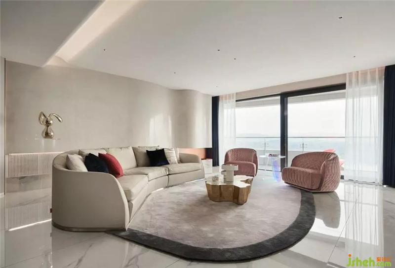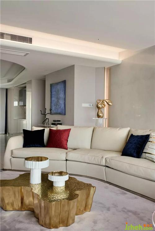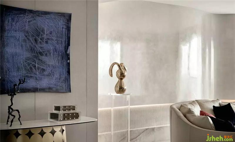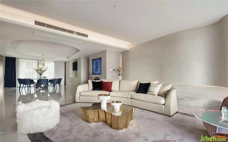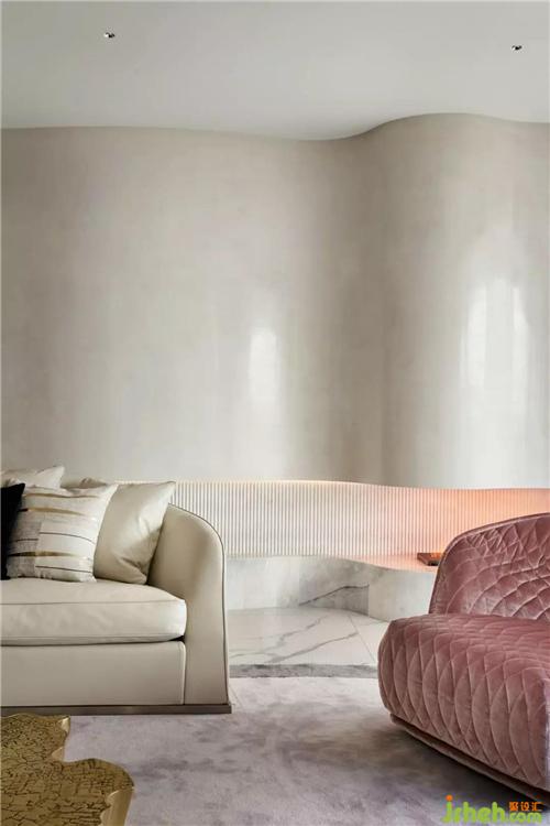 从顶面到墙面,以优雅的白色和米灰色铺陈了整个空间的基底,不规则弧形元素的使用,使空间灵动十足。