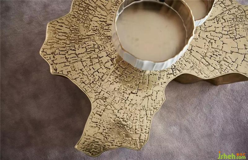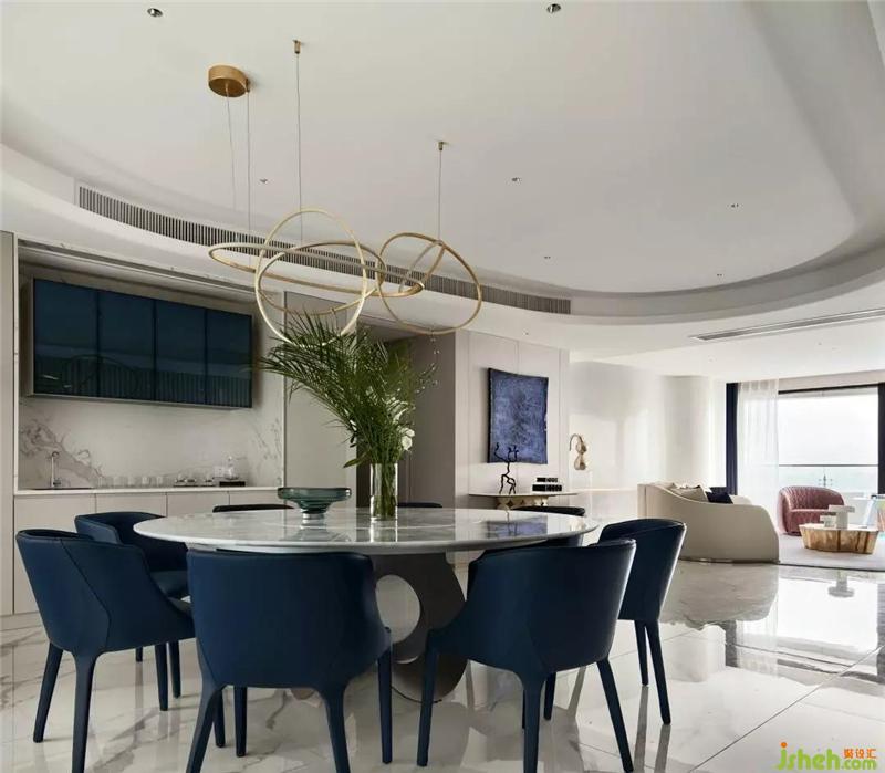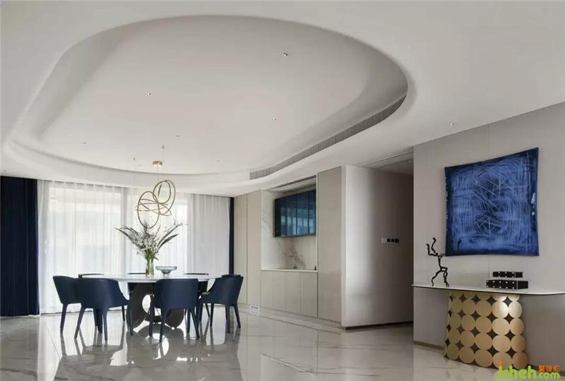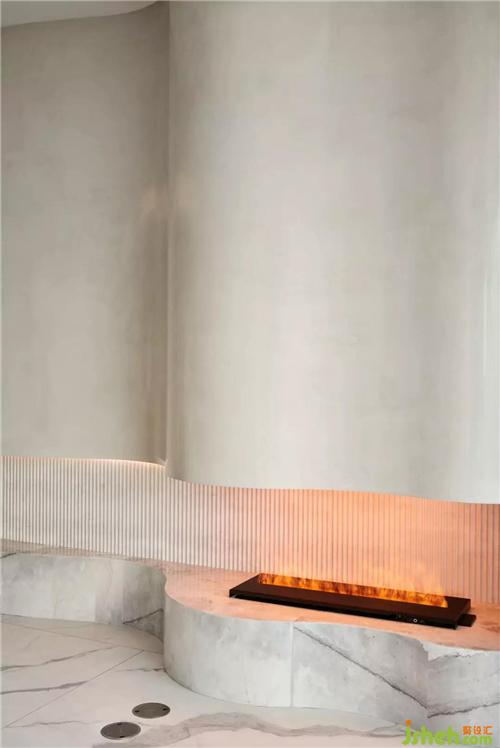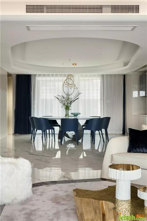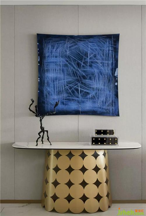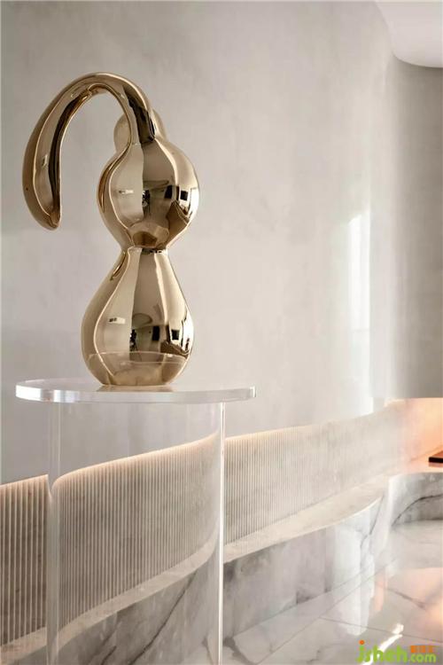 客厅沙发背墙以异形弧线造型打破传统直线的装饰,暗藏形体内的壁炉为家增添温暖氛围,半哑光艺术漆的使用彰显了空间极简美学,装修设计抽象装饰画和摆件注入十足的艺术气息,金色趣味兔呼应Boca Do Lobo茶几的配色,一切和谐而不乏生动性。