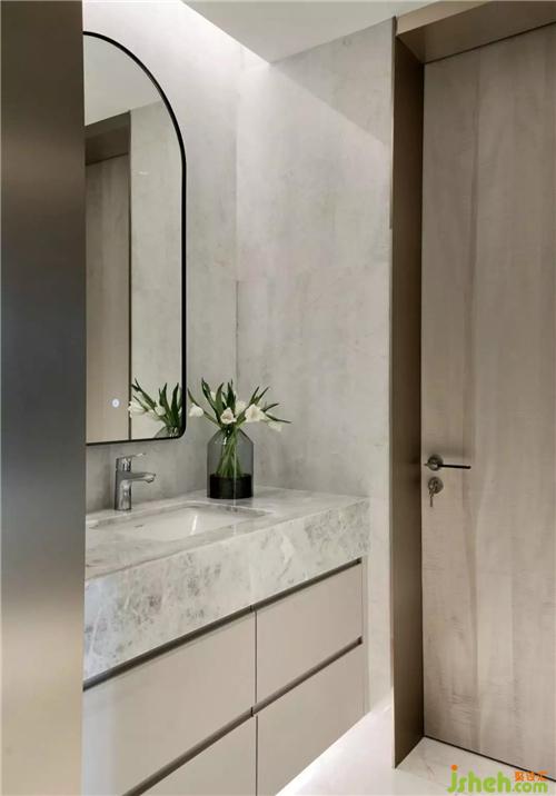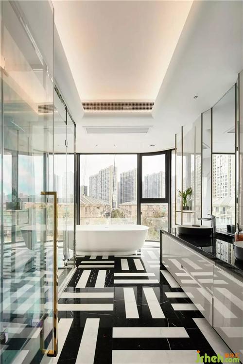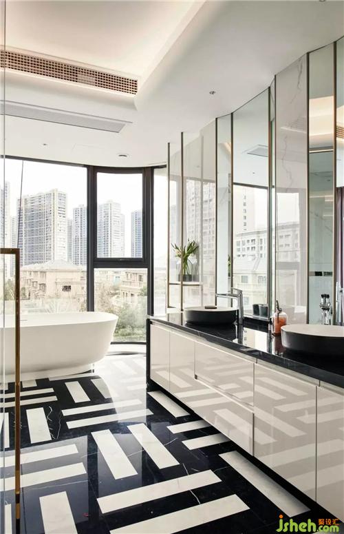 主卫在同样米白色基调中,加入黑白跳色的地面,增加空间时尚氛围,独立浴缸临窗而置,放松泡澡的同时亦可欣赏窗外的夜色,双台盆的设计更加人性化。