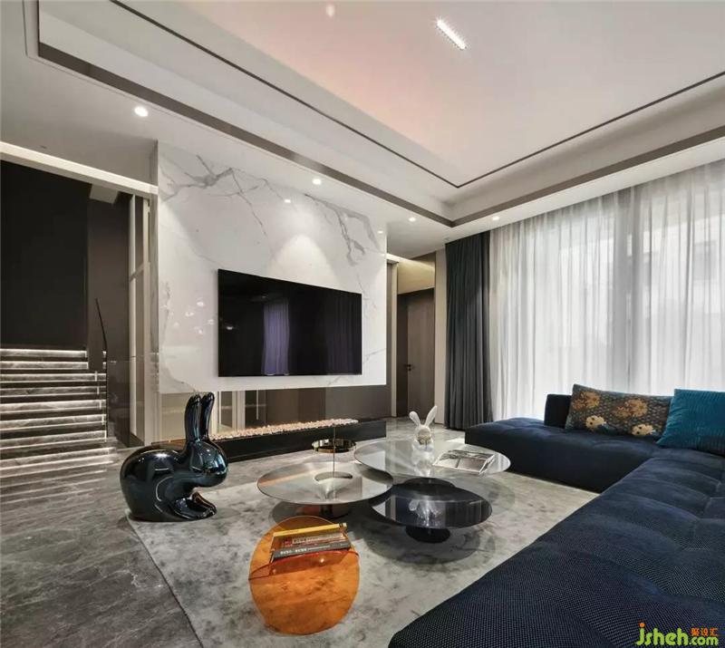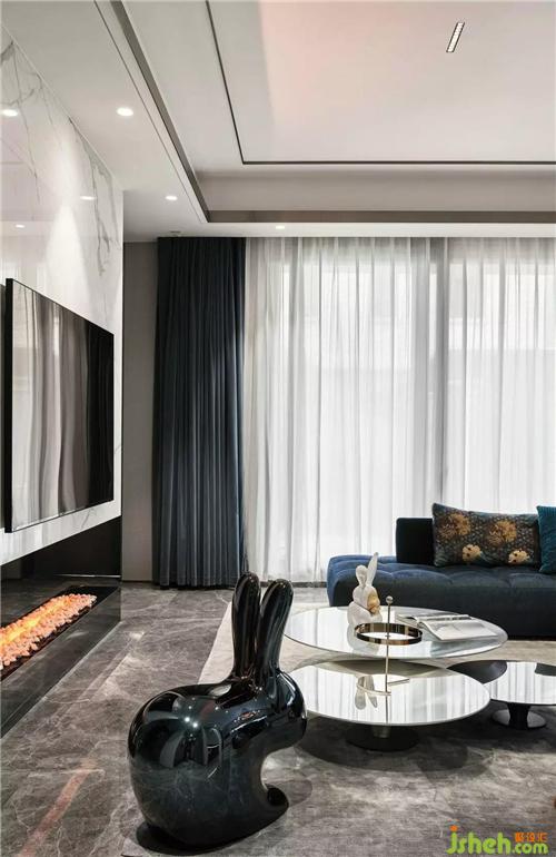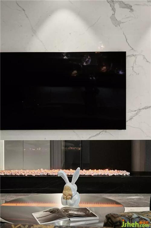 悬浮的电视墙设计,增加了空间的视觉延续性;真火壁炉的星火光芒、罗奇堡的沙发和茶几、稀奇艺术品的摆件,整个空间优雅时尚,彰显着主人对生活的态度。