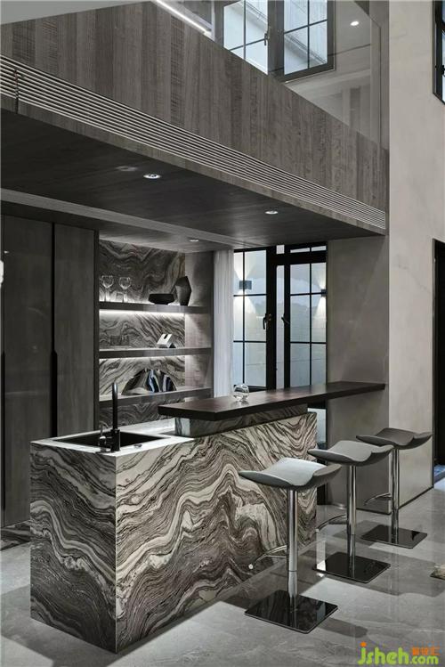 墙上的水滴艺术装置错落悬挂,更加丰富了空间的灵动性;水吧台的大理石纹路蜿蜒起伏,充满生机。