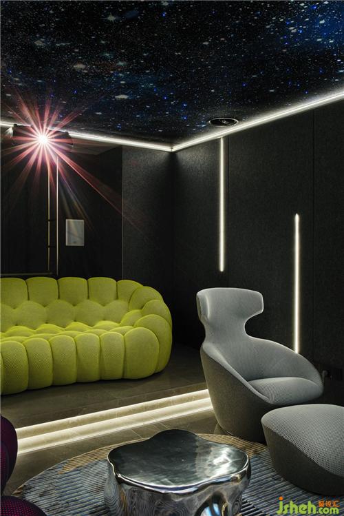 影音室在设计师的巧妙布置下,Bubble沙发像是置身星辰大海下五彩斑斓的梦境,灯光和材质完美呈现各自的魅力,空间交融互通,从细节到氛围充分展现给客户一个理想的体验空间。