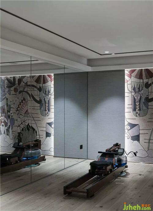负二层挑空部分规划出一个家庭健身房,划船机真的是当下最适合现代人的健身设备,一项可以坐着进行的有氧运动。线性灯和整面镜子的运用,光与影的交错,打造了一个理想的立体化健身空间。
