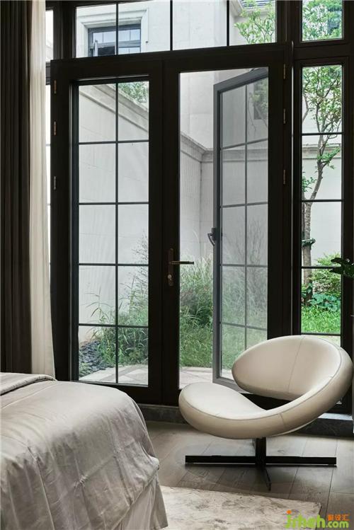 主人房深灰色硬包的背景,犹如夜晚降临,引导进入房间的人儿放下白天的疲惫和喧嚣别墅装饰,准备一个深度的睡眠,给身体机能一个饱满的修复。