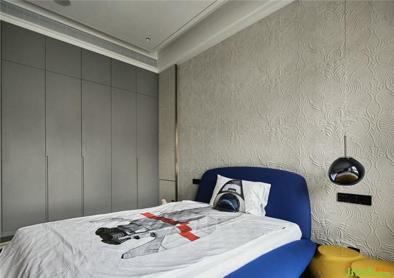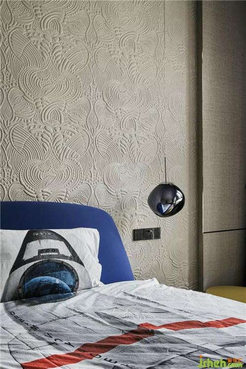 每一个孩童的内心都有一个飞向太空的梦想,背景凹凸肌理的壁布犹如月球表面,Tom Dixon的小吊灯充满科技感,蔚蓝色的床身和宇航服的床品,都在用父母的爱告诉小朋友:勇敢的去追寻你的梦想吧!