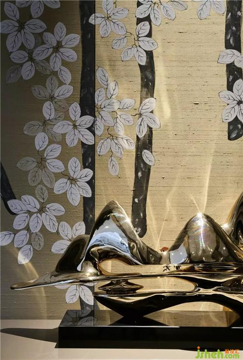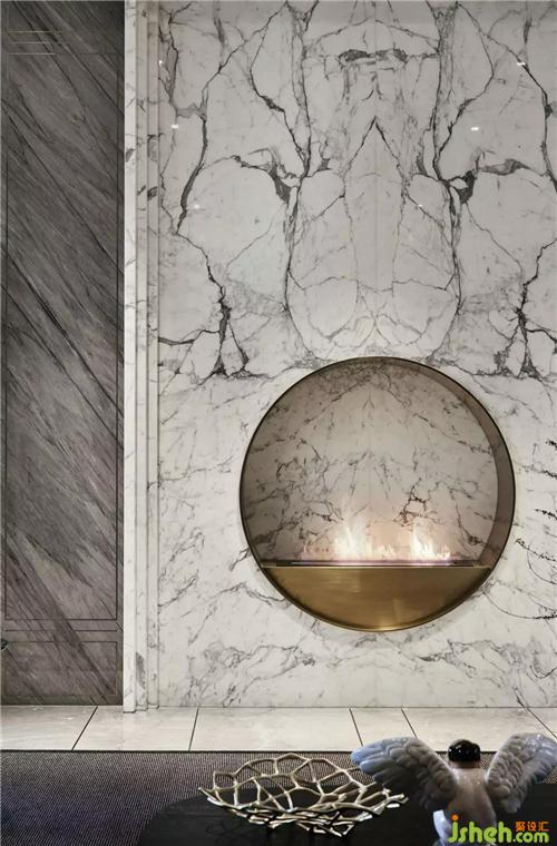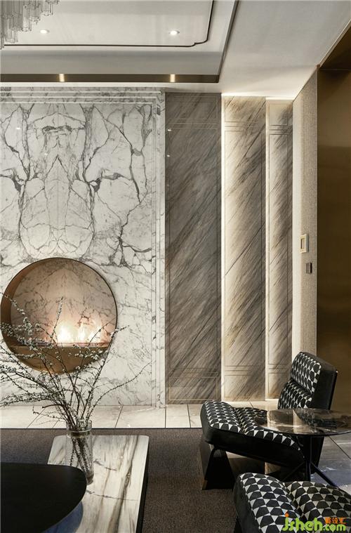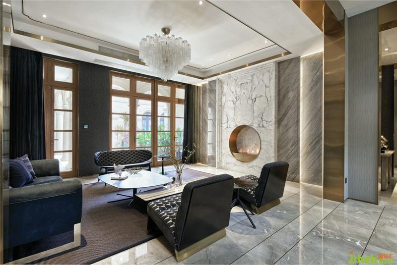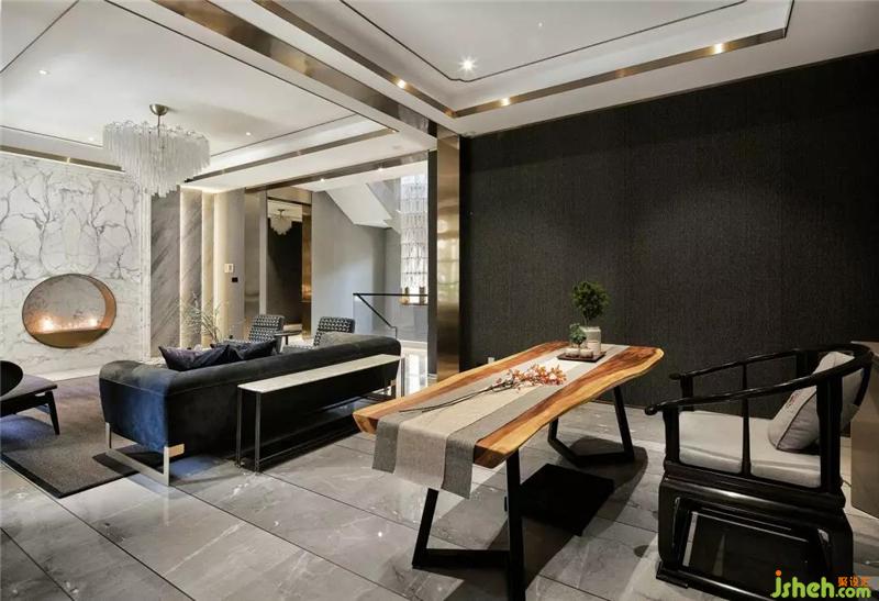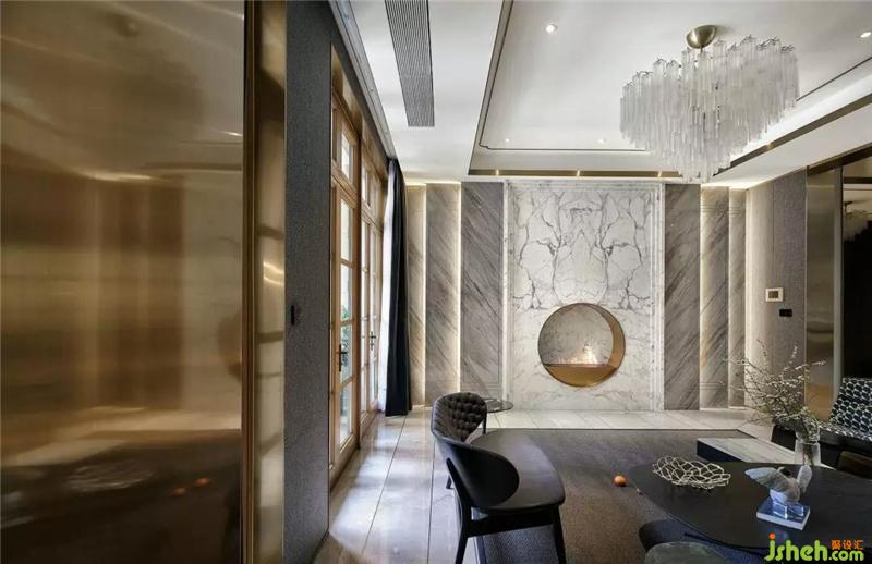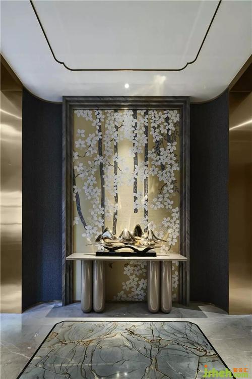 在这个远离尘嚣的法式合院里,更是于繁华都市中独享一片宁静,推开家门,扑面而来的繁花背景搭配金属材质的端景台,丰富的材质与色彩变化,增添雅奢趣味,方正开阔的空间,避免繁杂线条与多余家具,当居住者身处其中,亦能感受到空间开扬洗炼、明亮采光萦绕。