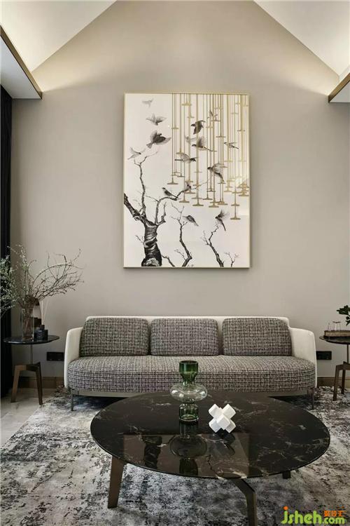 老人房配套的独立卫生间和起居室延续卧室基调,水墨画的背景,宁静而高雅,“人”字型挑高屋顶,空间感更强,也进一步映射出东方气息与现代生活品质。