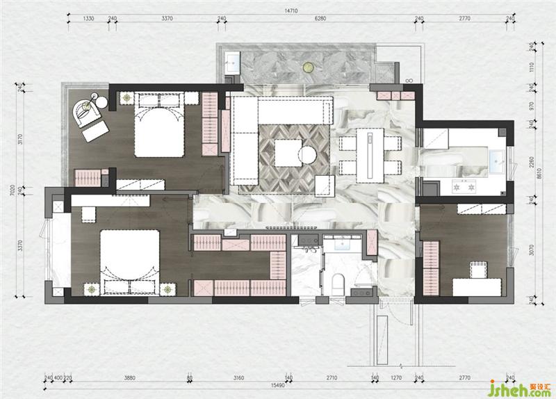 关于设计:原始户型有2个并排的卫生间,客户希望更多一些储物空间,在杭州装修设计师调整之后,主卧的卫生间改为衣帽间,孩子房的阳台合并到卧室,空间变得整体,也更符合主人的使用需求。