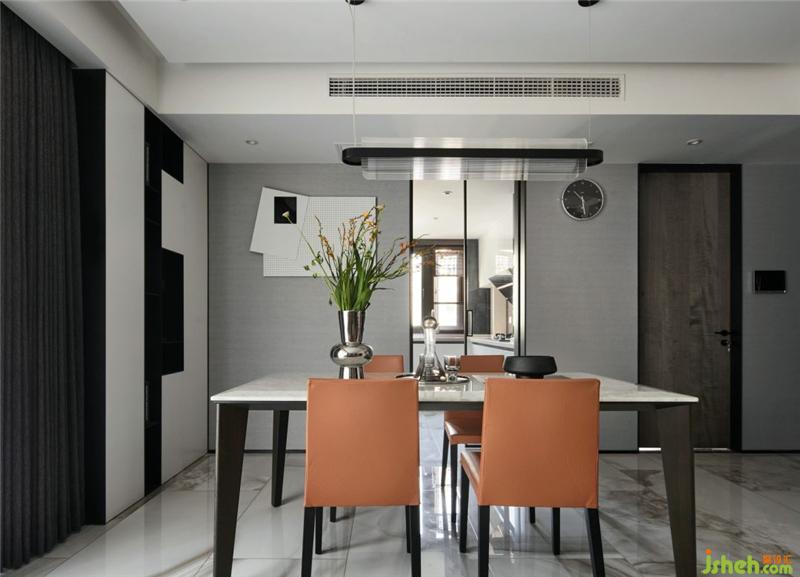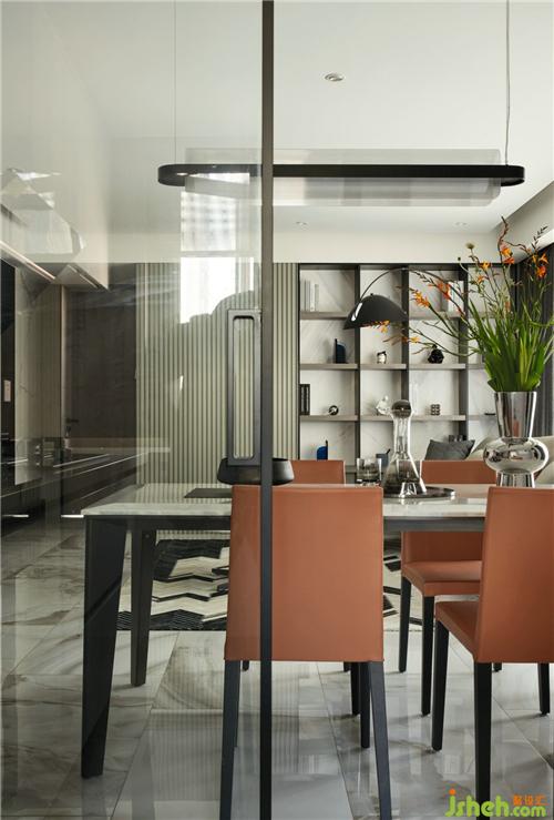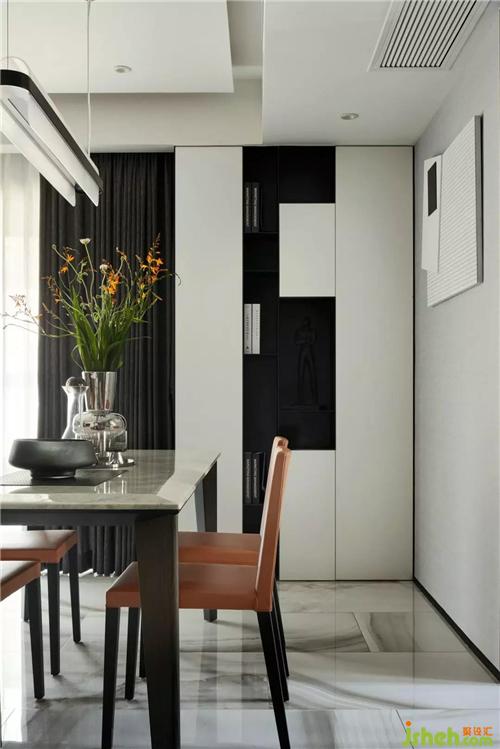 餐厅钢琴配色的装饰柜,在入户一进门就视觉聚焦,提升空间的艺术气息。
