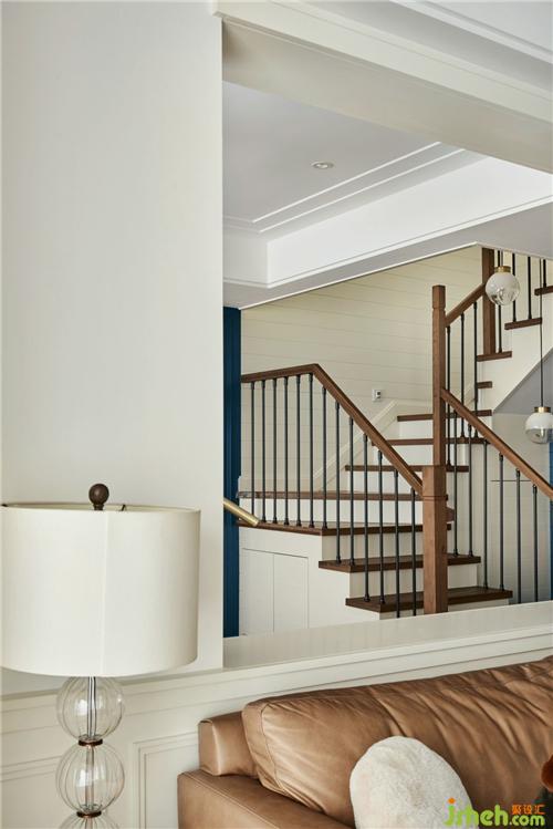 杭州装修设计原木楼梯让人感受自然宁静的气息,同色扶手及黑色的铁艺搭配,视觉和触觉伴随着空间的展开,自然传递。