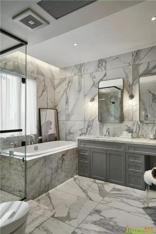 花白大理石和灰色洗手柜的简单配色让杭州装修设计卫生间显得干净清爽,雅致趣味。