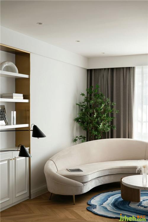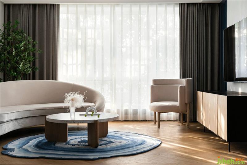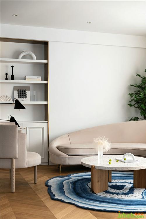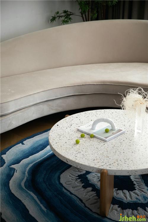 穿过玄关,以白色+木色为主调的客厅简单而随性,自由而惬意,圆润的沙发和茶几柔和了空间四面的棱角,一抹跳跃的蓝给人带来一种宁静高贵的视觉感受。
