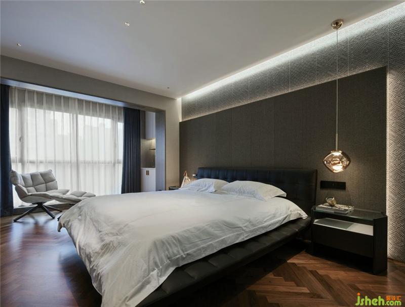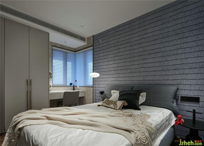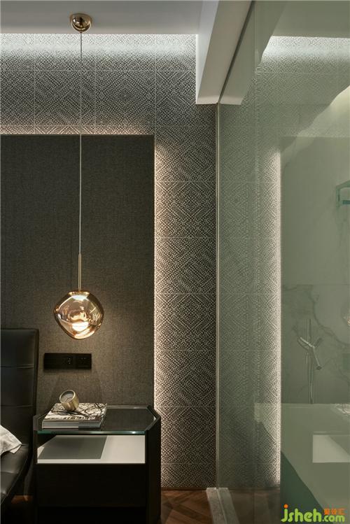 次卧室质感强烈的壁纸增加了整个空间舒适度,个性的灯具,冷淡中又不失趣味。