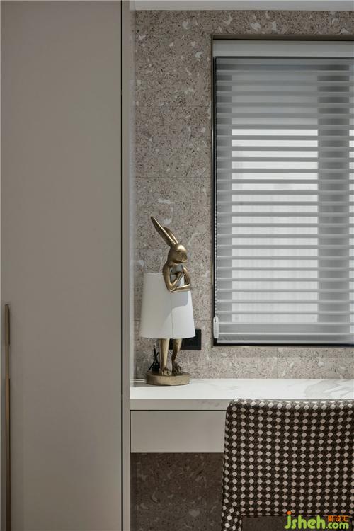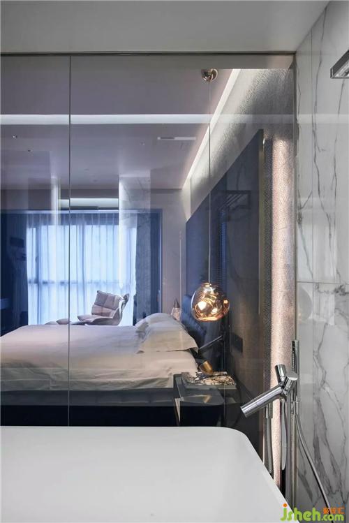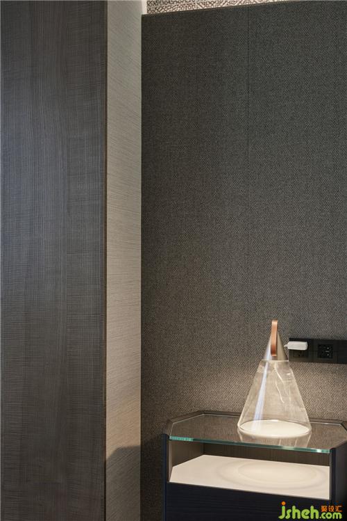 二层主卧内不同质感材质混搭刻画出肌理、明暗的变化,玻璃材质的柜门,通过唯美的规划分割,完美实现功能与美感的结合,盎然有趣杭州装修设计。