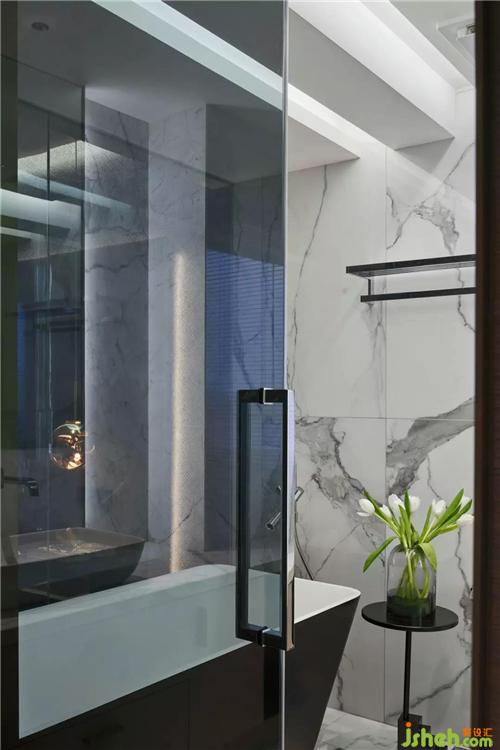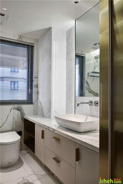 主人卫的设计时尚有格调,一体定制的洗手台,大面积的雪花白大理石,灰玻的运用,丰富了空间层次。