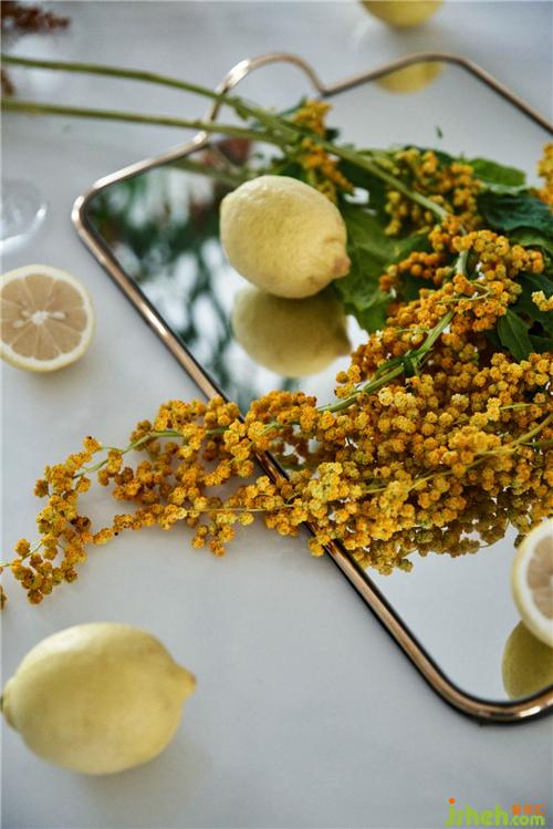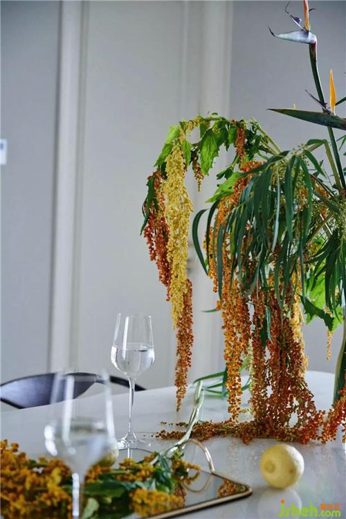 餐厅在保留原功能柜的同时,依然延续客厅的设计,从色彩到配饰整体调整氛围,白色圆球球项链灯个性而独特,搭配餐桌上春华秋实的花艺,一派丰收的景象。