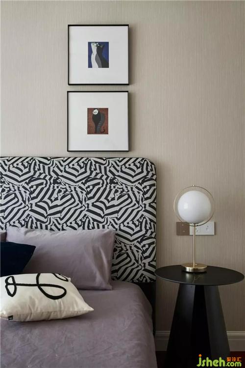 次卧室黑色纹路的床背,充满个性时尚感,装饰画的重叠竖排和动物变形的图案,无形增加了空间的趣味性,金属球形灯更是在空间起到点睛的作用。