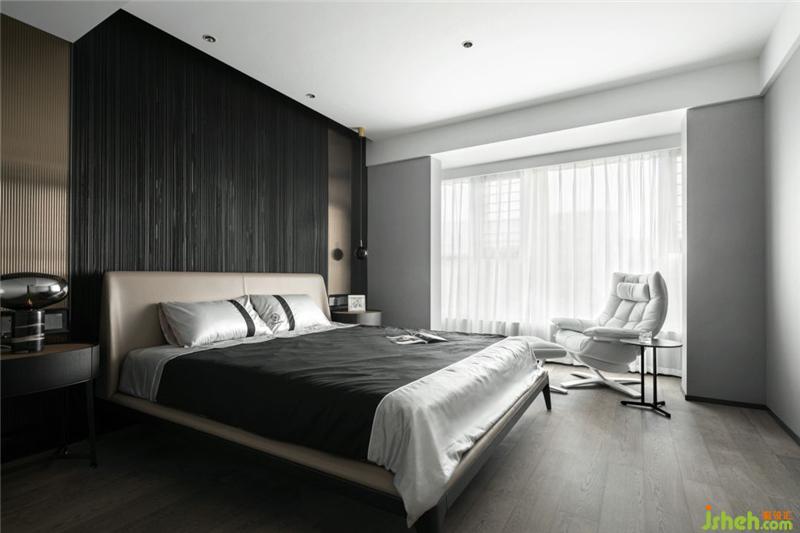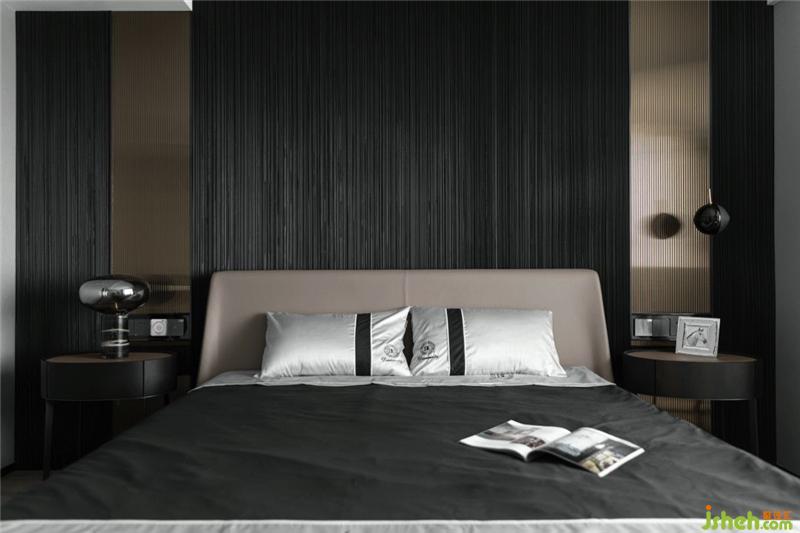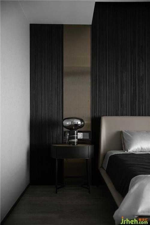 深灰调的壁纸背景和长虹玻璃线条肌理美妙,黑白灰的色调营造出极简轻奢的意境。