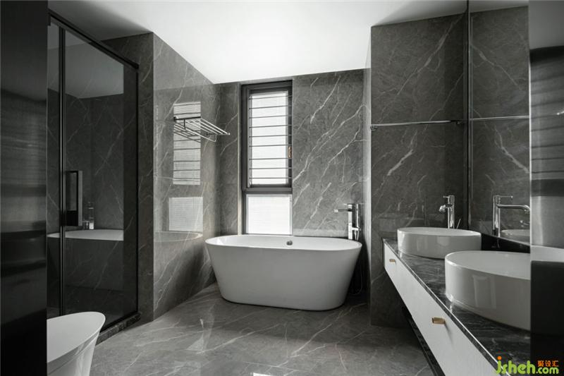 大面积的灰色大理石其细腻光泽质感覆盖整个卫浴,白色陶瓷点缀其中,杭州装修设计极简质感油然而生。