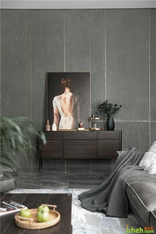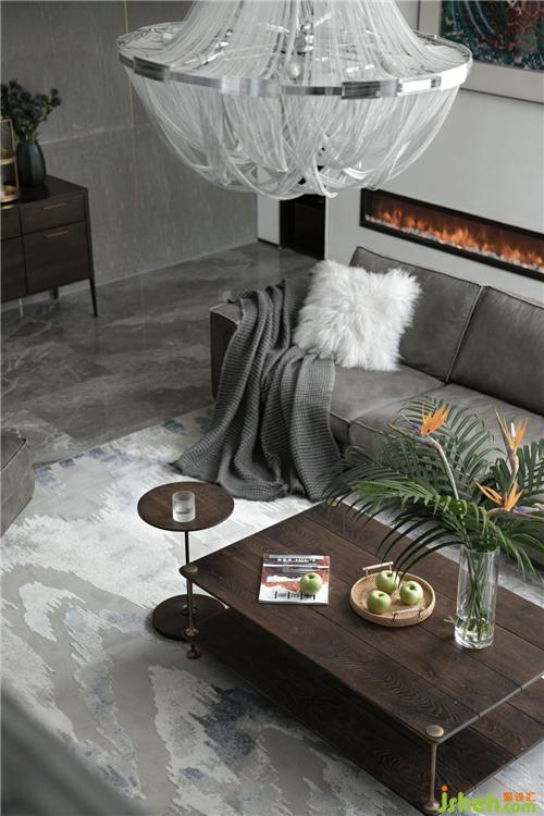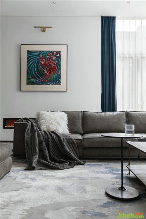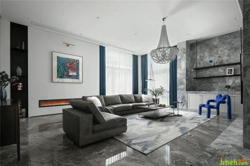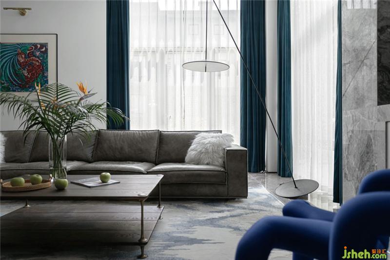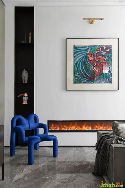 客厅双朝向的落地窗,使空间在不同的时间段内都光线充足,沐浴阳光之下,一杯茶水、一本书可以坐享一天的悠闲时光。在灰色大理石和白色墙面的基调里,窗帘与装饰画的湖蓝色点缀其中,既中和了空间的温度又构造了美好生活的音律。