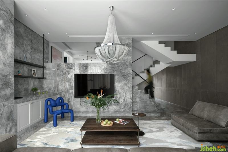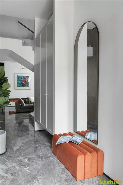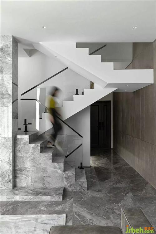 转过客厅,灰色石头上雕刻一体的踏步,白色的转折楼梯,装饰空间的同时,又引领着生活的幸福篇章继续铺展开来。