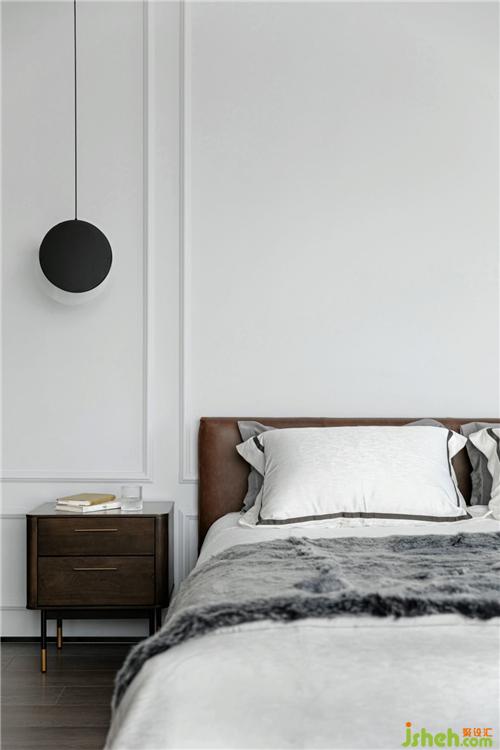 卧室以白色为基调,黑白的床品、卷纹的壁画,都营造了一个放松休闲、宁静舒适的休憩空间,而落地玻璃窗将视觉延伸出去,随即可观赏窗外美景。