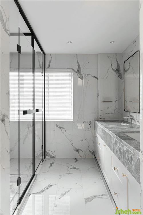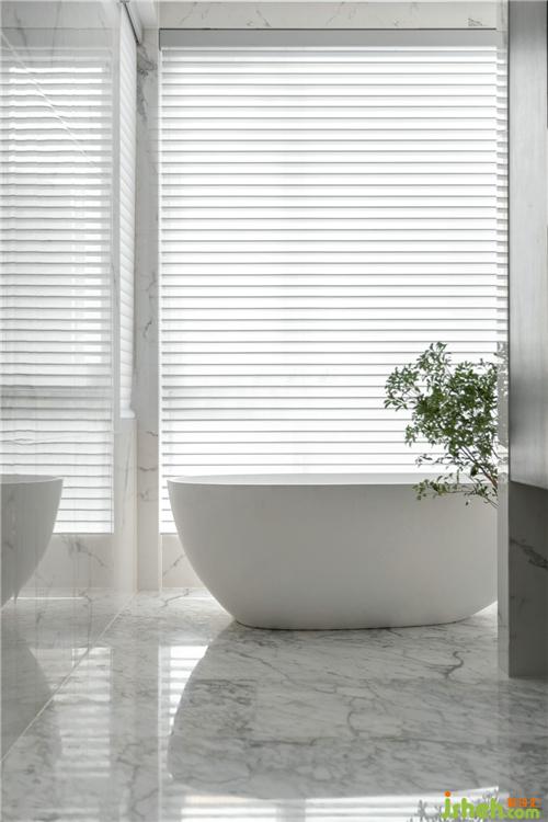 透过窗纱的光线变得柔美朦胧,映照卫生间大面积的白色花纹大理石,整个杭州装修公司空间纯净自然而不乏现代时尚质感。