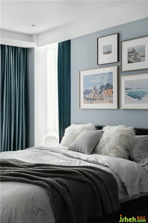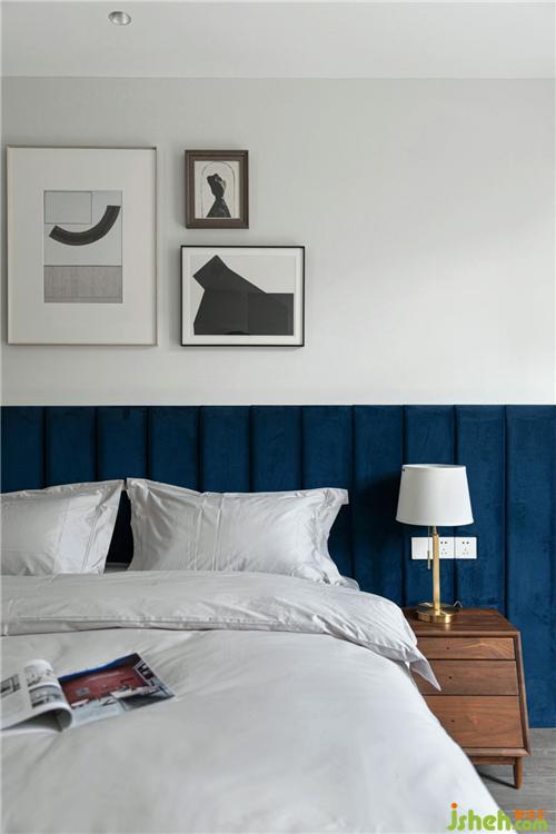 次卧纯色的墙面配上湖蓝色的床靠背,营造了一个宁谧自然的氛围,简约的组合挂画,使整个空间的设计感顿时提升,成为卧室里的点睛之笔。