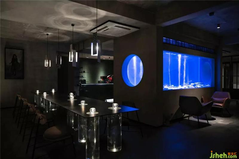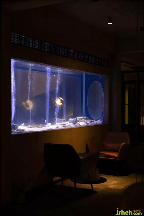 步入室内,首先映入眼帘的是一个鱼缸,它有一个凄美的名字叫 “鲸落”,懂的人自然明白,一只鲸落的消失殆尽才有了现在的万象平衡,透过鱼缸,窗外的景色似乎和海底世界融为了一体。