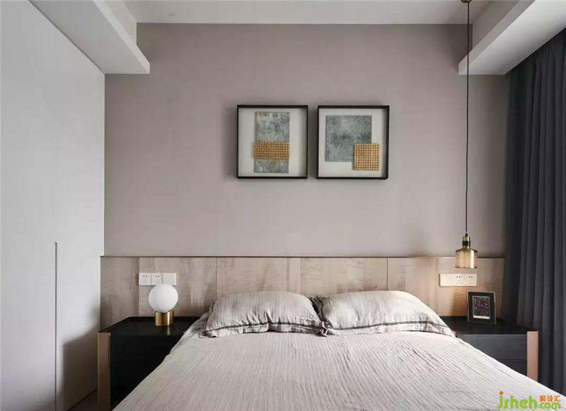 次卧室暖咖色温馨细腻,上海室内设计师原木床背添加了大自然的风味,金属小吊灯和装饰画的搭配,更使空间质感时尚。