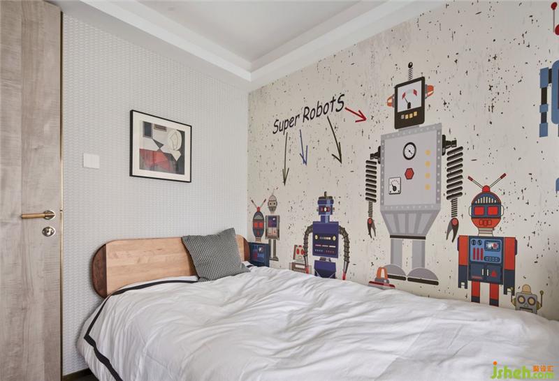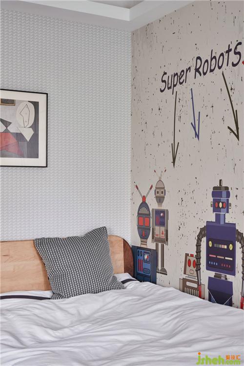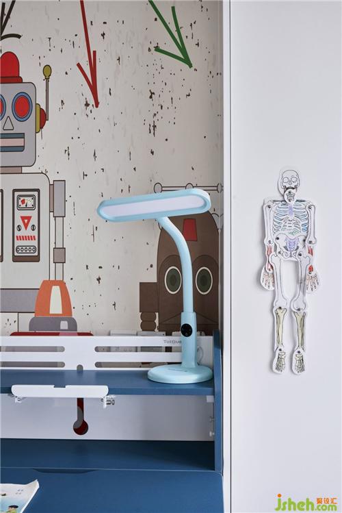 孩童总是对世界充满着无限的好奇与想象。男孩房在主色调的基础上增添了不同维度的浅蓝色用以装饰,用色彩传递情感,充满未知与想象力。