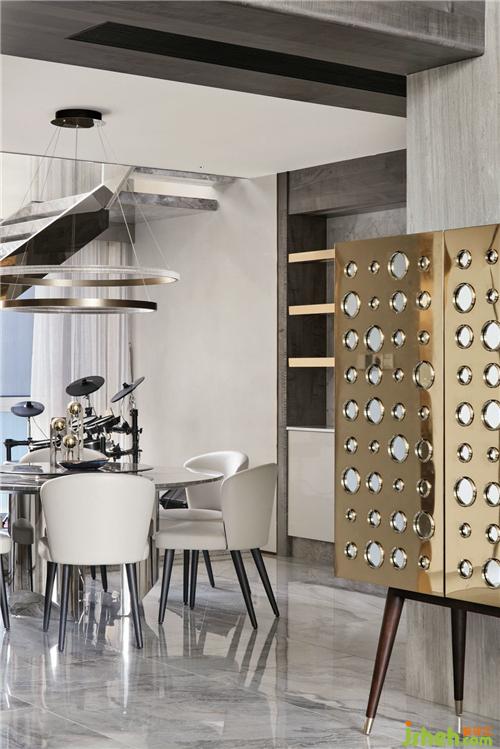 玄关进门映入眼帘的就是这个金光璀璨的餐边柜,搭配上走廊尽头的跳色装饰画,赋予餐厅活跃气氛;黑色大理石餐桌搭配白色皮料餐椅,经典但又高级的搭配,加上华丽吊灯的渲染,营造出餐厅温馨奢华的用餐氛围。