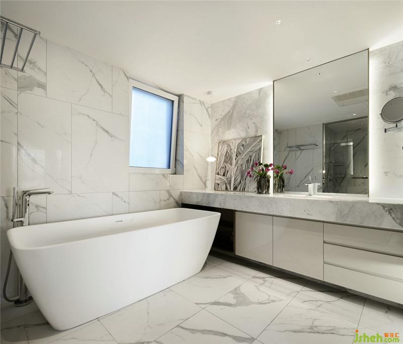 大面积白色纹理的瓷砖交错铺贴,充满整个卫生间墙面地面,给人简洁大气的视觉体验,在角落中,搭配上乱中有序的装饰画和颜色鲜艳的花束使整个空间既干净又有焕然一新的感觉杭州别墅装饰。