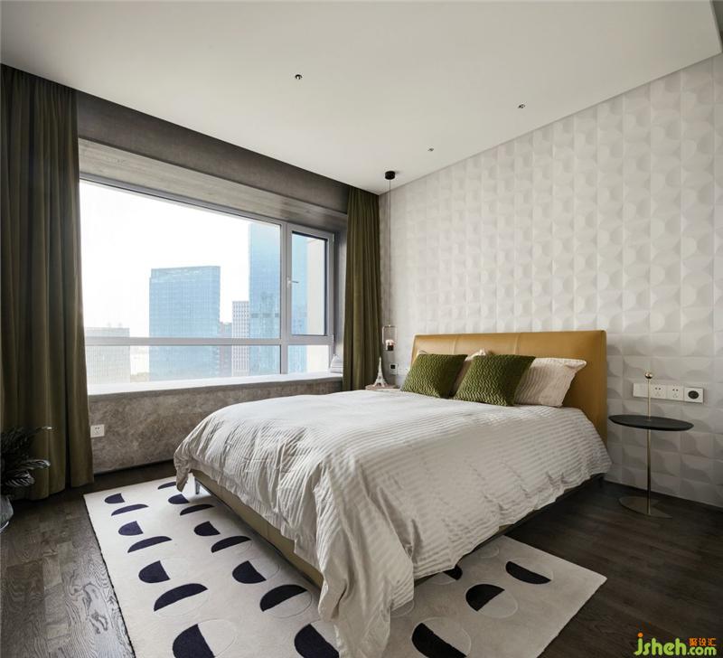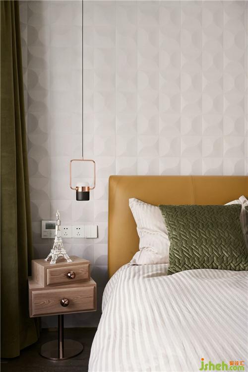 有立体肌理的白色墙纸搭配不规则床头柜使得整个次卧充满活力。